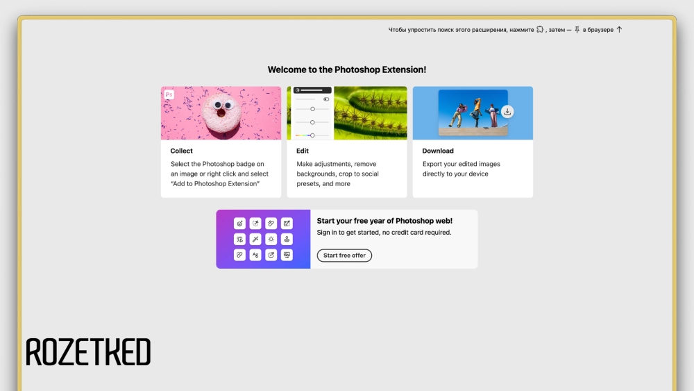 - Установить расширение Adobe Photoshop из магазина Chrome. Другие браузеры вроде Edge и Brave также подходят, так как умеют работать с расширениями Chrome. Расширение доступно только с зарубежного IP-адреса.