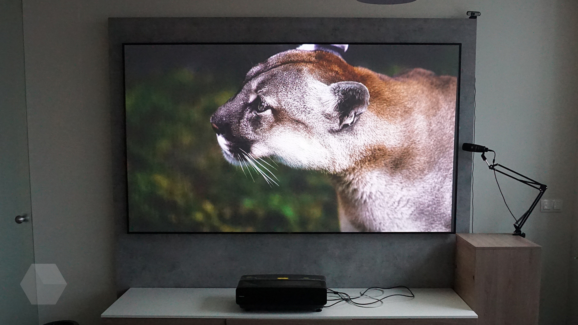 Это позволяет без потери качества изображения размещать проектор максимально близко к экрану. То есть, лазерный телевизор представляет собой висящий на стене экран с диагональю 100 или 120 дюймов и стоящий рядом на невысокой тумбе проектор, размещённый на расстоянии всего лишь около 28 см перед экраном, а вовсе не под потолком, как привычный проектор. Да и провода всегда аккуратно убраны.