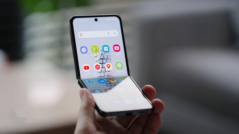 Ещё одна новинка 2022 года от Samsung — Galaxy Z Flip 4, который представляет собой уже типичную «раскладушку», как у бабушки. Основные претензии к нему — габариты, поскольку телефон получился слишком длинным и слишком узким, пользоваться не совсем удобно.