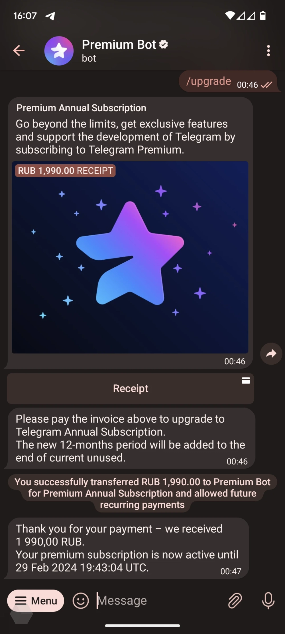 Чтобы перейти на новый годовой тариф, нужно отправить боту команду /upgrade, и он сразу предложит оплатить счёт за всё те же 1990 рублей. У многих команда уже заработала, некоторым понадобится ещё подождать — функция развёртывается постепенно.