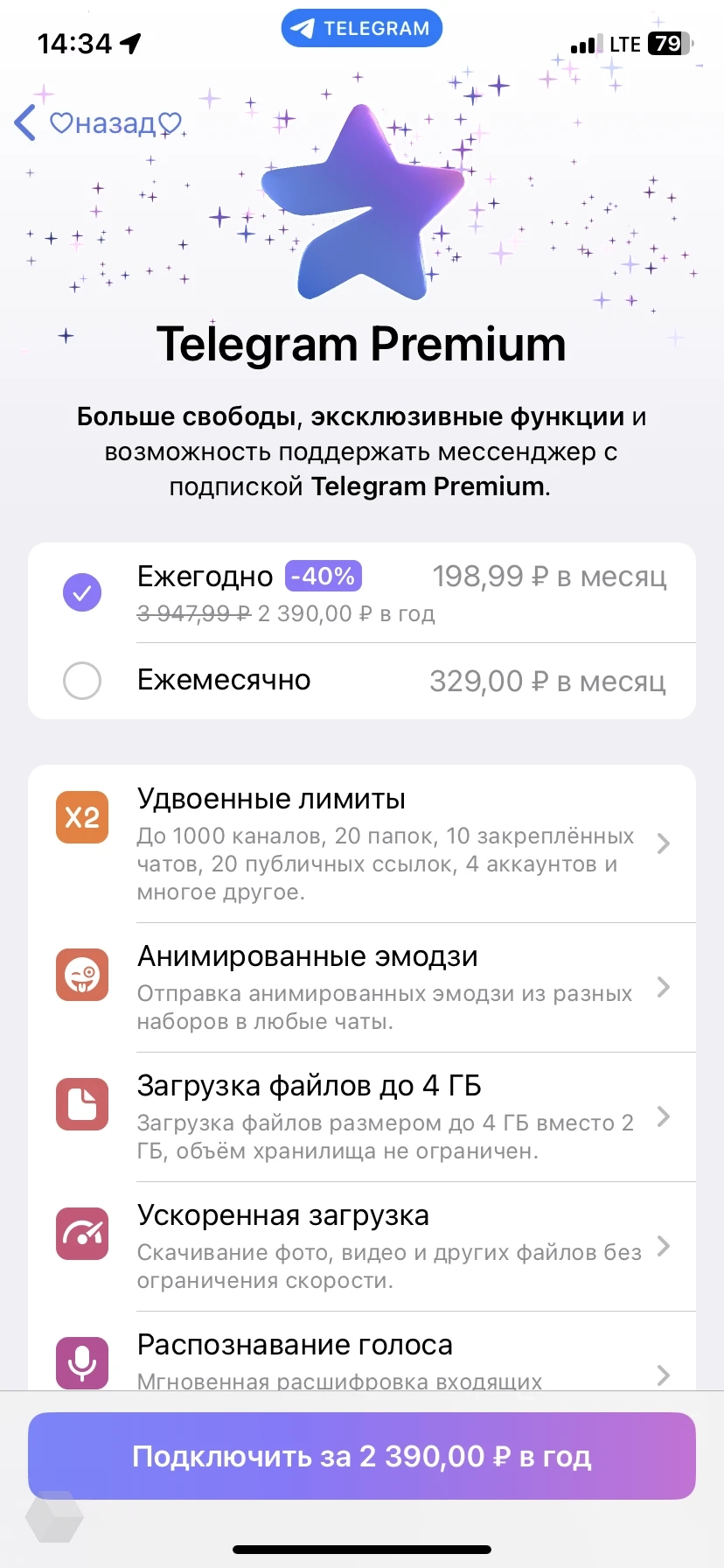 При оплате с мобильного счёта через Apple ID подписка на месяц обойдётся в 329 рублей в месяц, а на год — 2390 рублей (199 рублей в месяц). Для этого нужно открыть настройки, пункт Telegram Premium и выбрать опцию «Ежегодно». Скидка в данном случае составит 40%.