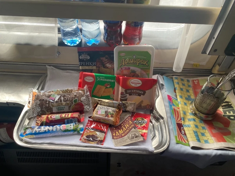 Оказалось, что в двух из трёх поездов моего маршрута — суточном до Оренбурга и на двое суток до Сочи — нет не то чтобы предоплаченного питания, в целом вагона-ресторана нет. Всё, на что можно в этом случае надеяться, — «Роллтоны», чипсы и пряники у проводника, а также русская рулетка с едой у бабушек во время остановок поезда, либо примерно аналогичный проводнику ассортимент в палатках на некоторых платформах.