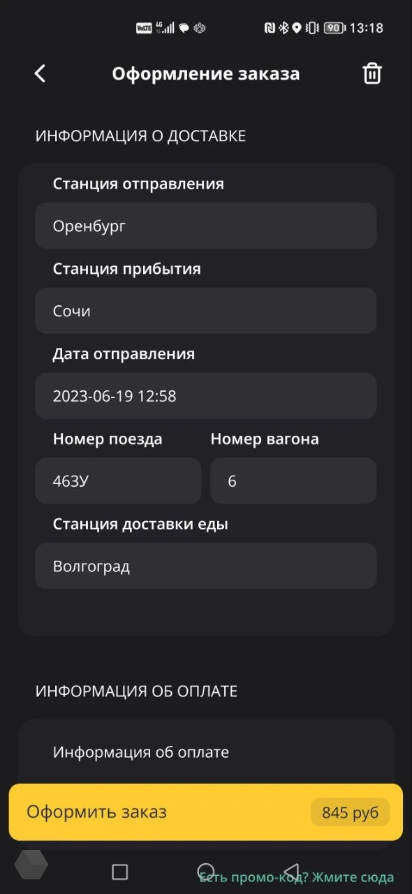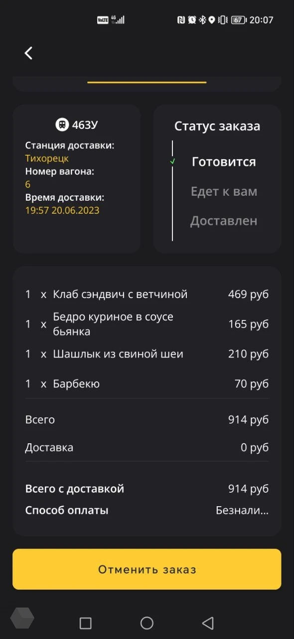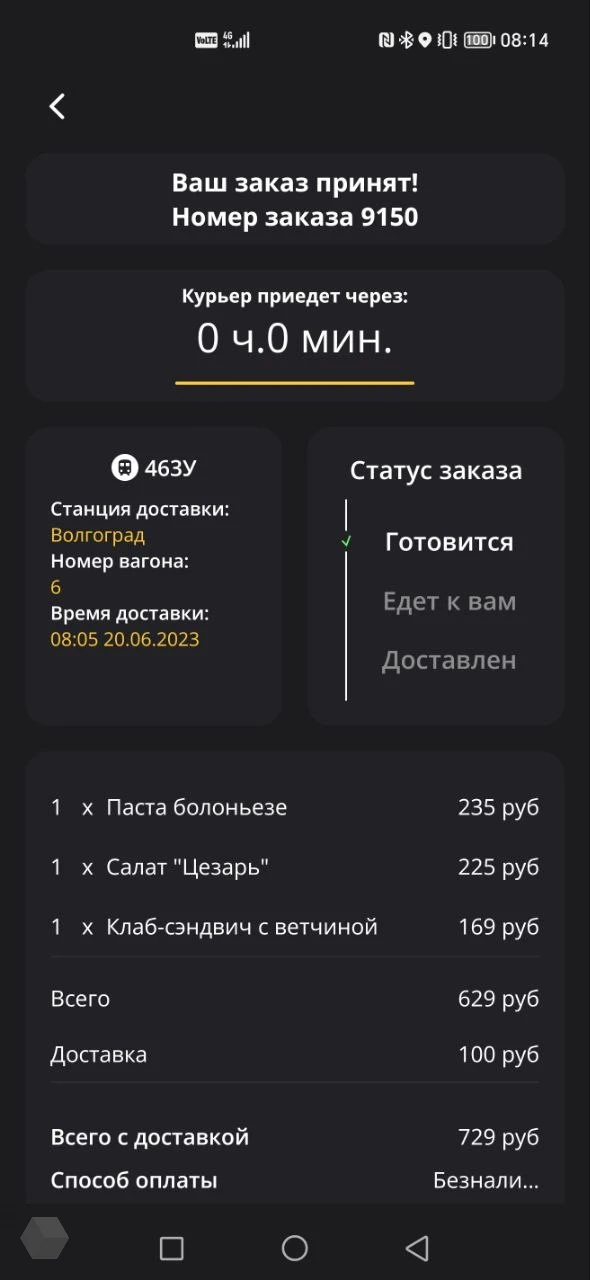 Немаловажный момент: заказать доставку нужно заранее, до отправления поезда. А можно, как и я, уже находясь в пути, тут главное за 2 часа до доставки успеть разместить заказ, иначе не успеют приготовить и привезти. Оплата чаще всего внутри приложения, иногда — курьеру (переводом, наличкой).