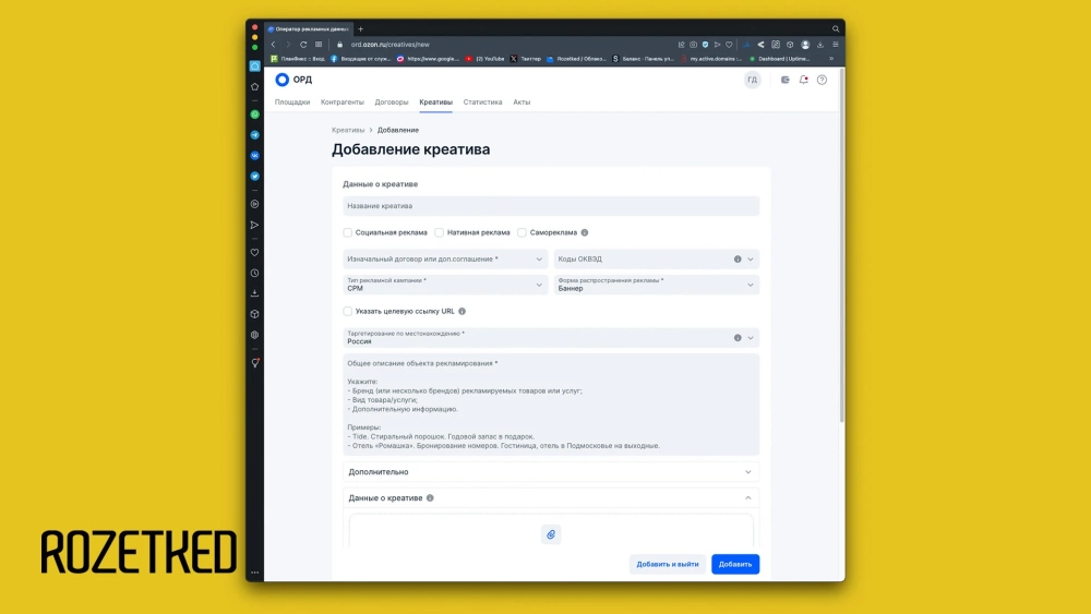 Михаил: Регистрация в ОРД — это теперь обязательной этап в жизни любого маркетолога, креативщика, продюсера и так далее. По закону нужно отчитываться о своих рекламных активностях, это помогает рынку функционировать прозрачнее и понятнее для всех участников. Со своей стороны мы сделали процесс регистрации в Ozon ОРД простым и быстрым — всего 10 минут. Через Ozon ОРД можно маркировать любые рекламные кампании на любых площадках.