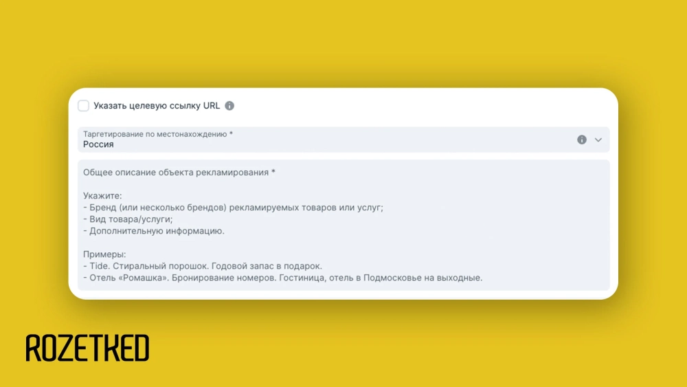 Михаил: А это поле уже обязательное, мы в интерфейсе указали, как его нужно заполнять. Главная задача — чтобы было понятно, что вы рекламируете, для какого бренда. В каком именно формате вы делаете кампанию неважно, нужно описать только объект рекламирования.