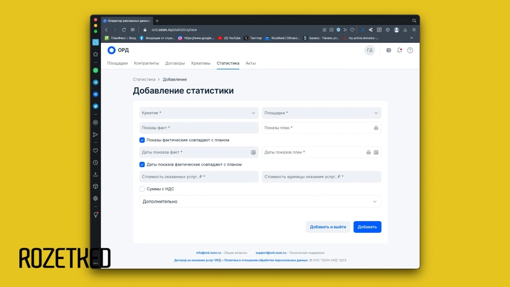 Давайте на примере интерфейса Ozon ОРД разберёмся с основными понятиями. Есть 3 типа площадки, расшифруйте с примерами, что есть что? Вот сайт Rozetked.me — это какой тип площадки? А YouTube-канал Rozetked? А ВК-группа или Telegram-канал Rozetked — это что? А если бы у Rozetked было своё Android-приложение, куда мы выкладывали бы контент (может и появится со временем) — куда отнести эту площадку?