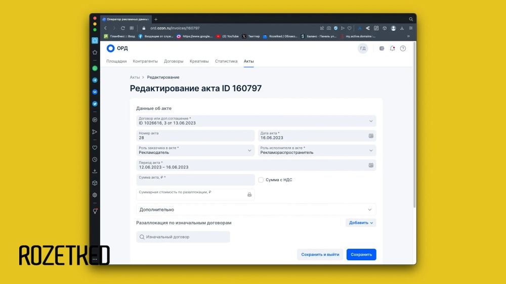 Например, вы агентство и подписываете договор с блогером на размещение рекламы бренда «Колодец», в разаллокации акта вы укажите данные вашего договора с «Колодцем» — потому что он и является рекламодателем.