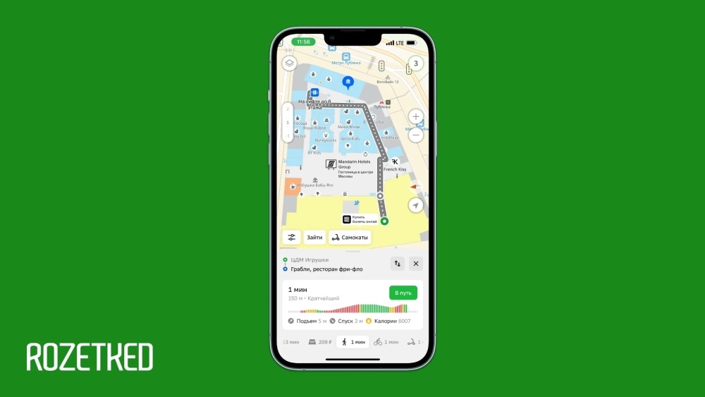 У «2ГИС» есть карты этажей — более того, можно построить пеший маршрут внутри здания. Например, легко разобраться, как дойти до обувного на четвёртом этаже или отыскать свою машину на паркинге. Сервис учитывает все повороты, лифты, эскалаторы и лестницы.