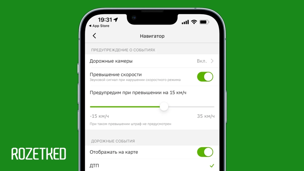 Если пропустили знак о скоростном ограничении, «2ГИС» напомнит. Если превышаете (скорость можно выставить заранее), голос заботливо предложит сбросить скорость.