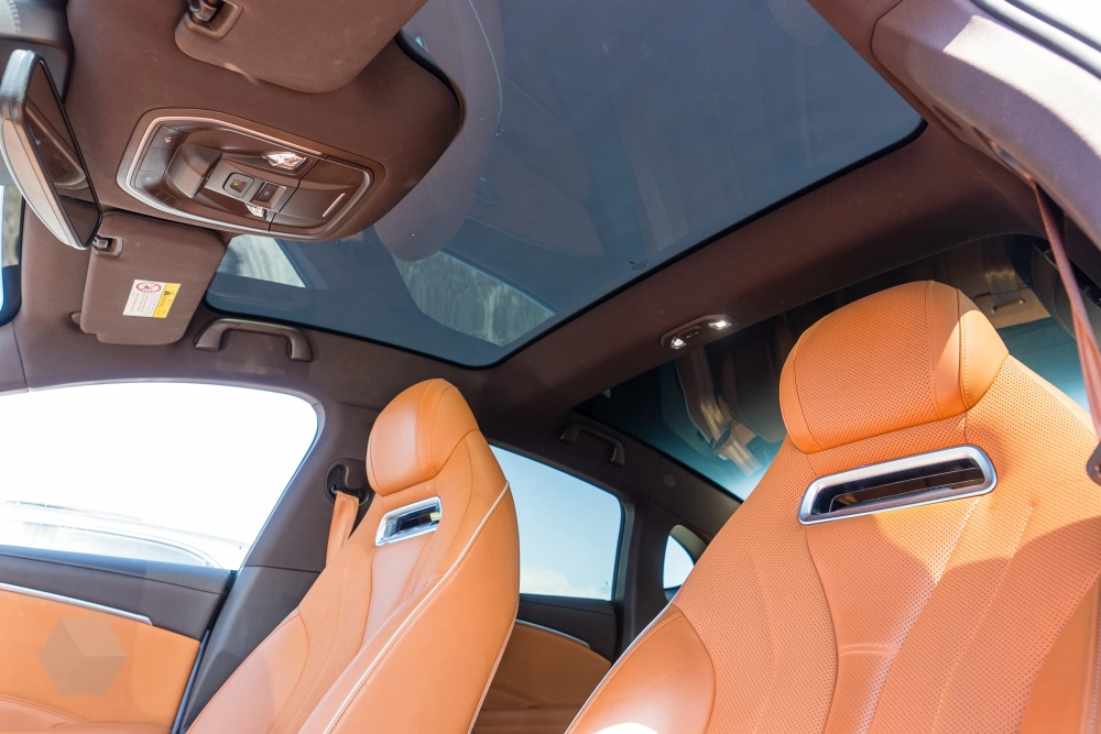 Кресло переднего пассажира так вообще умеет раскладываться в так называемую «нулевую гравитацию». Из-за этого и ремень безопасности сделан прямо в кресле. Везде приятная на ощупь кожа. Огромные дисплеи на всю переднюю панель, беспроводная зарядка и куча места для ног. В плане размещения пассажиров всё очень комфортно.