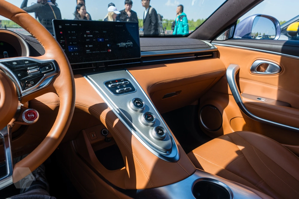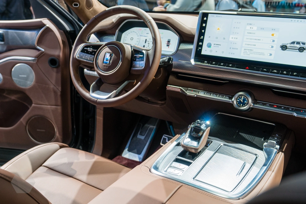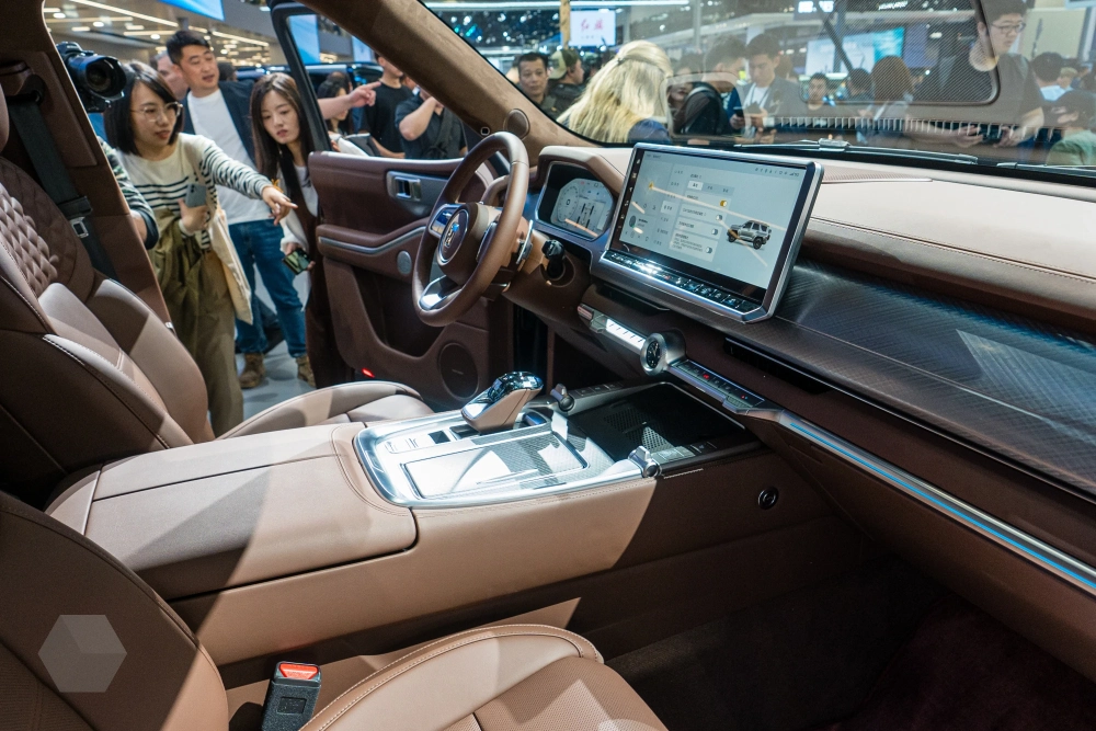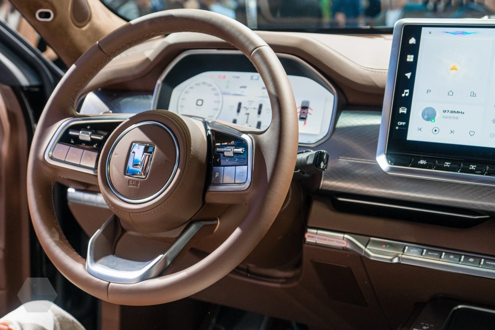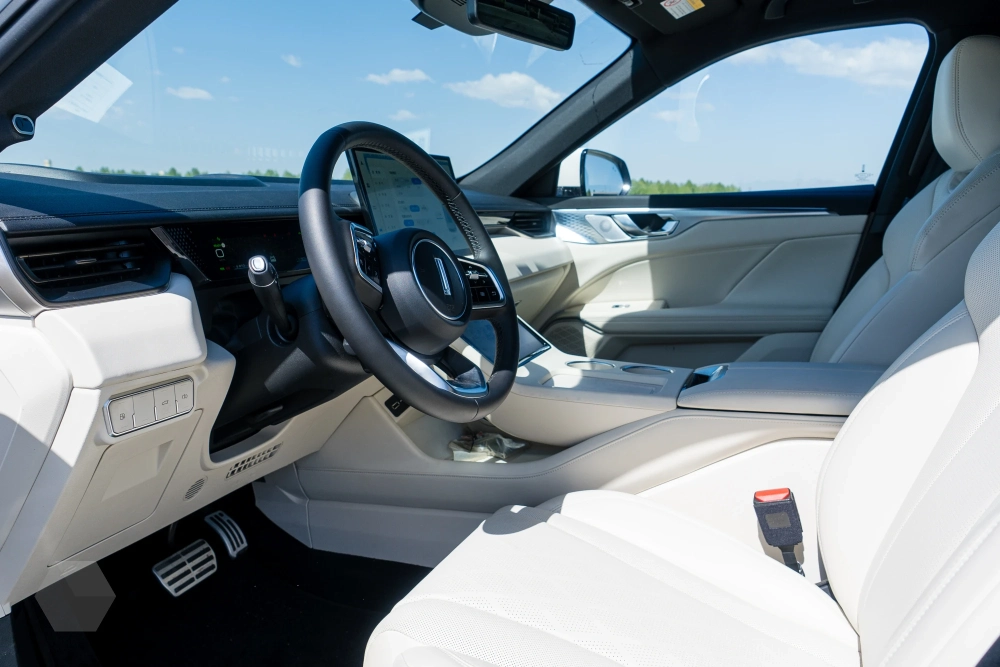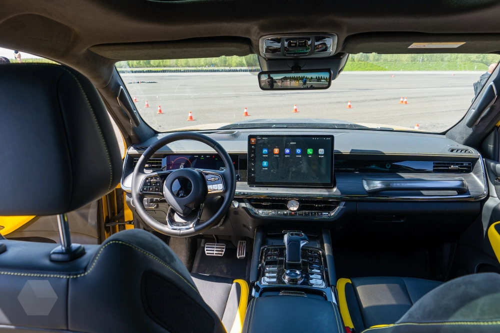 Внутри Poer, ожидаемо, такой же гигантский, как и снаружи. Но по убранству всё сдержанно и скромно. Дисплей, аналоговые кнопки, экокожа и яркие жёлтые акценты.