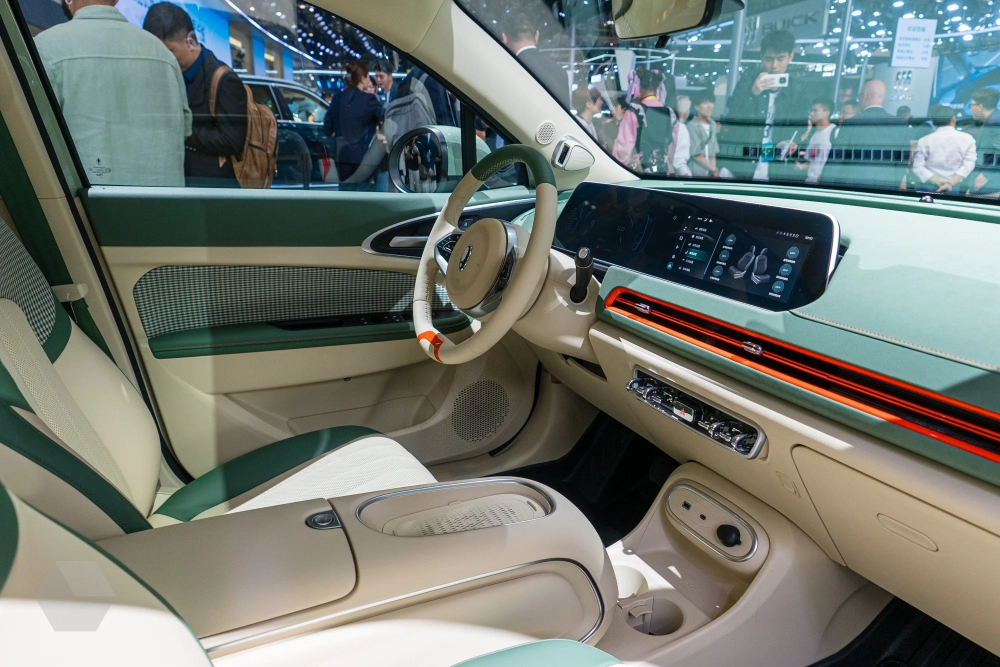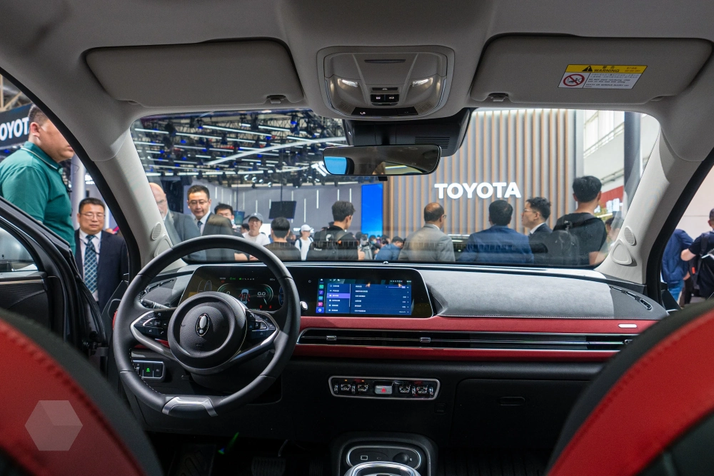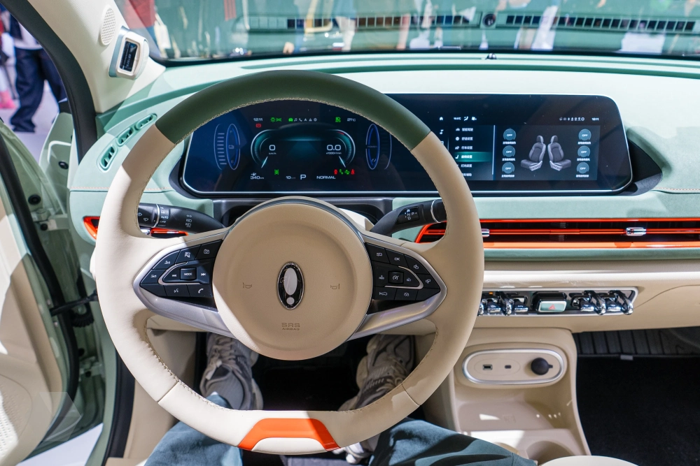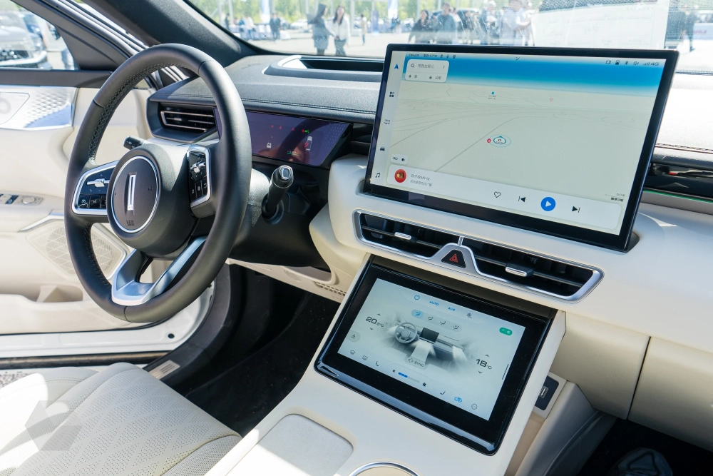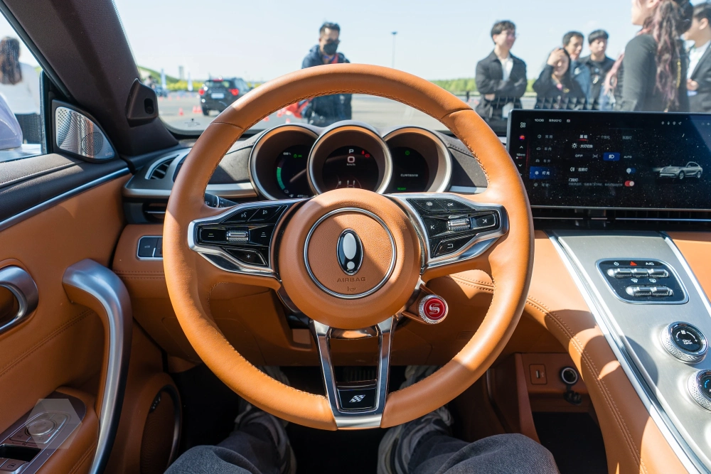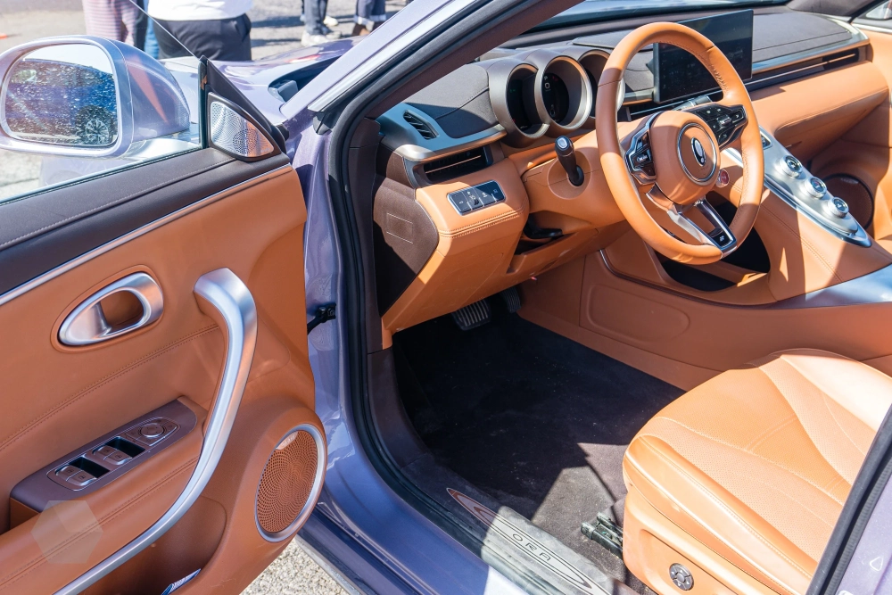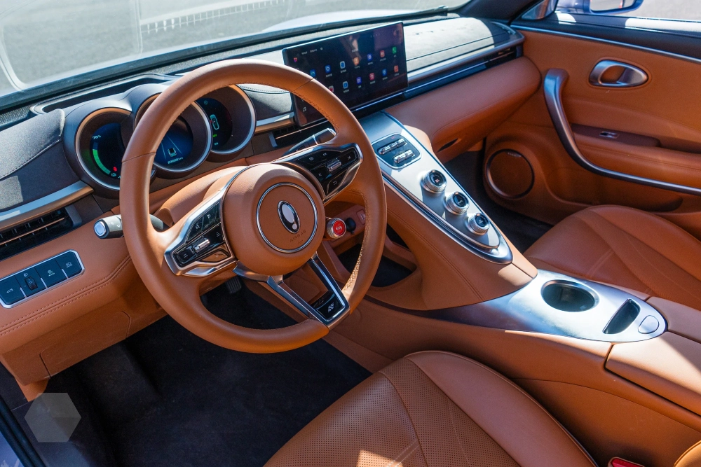 Внутри Poer, ожидаемо, такой же гигантский, как и снаружи. Но по убранству всё сдержанно и скромно. Дисплей, аналоговые кнопки, экокожа и яркие жёлтые акценты.