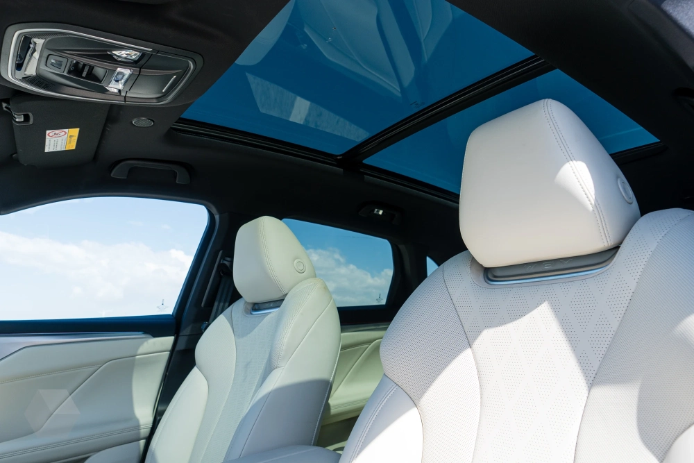 Салон в «коже», сидения с перфорацией и массажем, вся приборка виртуальная, проекционный дисплей, по центру экран на 12,3 дюйма. Мультимедиа резво откликается на касания и быстро крутит анимации. Камеры в круг, адаптивный круиз, системы автоторможения и удержания в полосе — всё это есть. Словом, полный набор мозгов современной электрички.