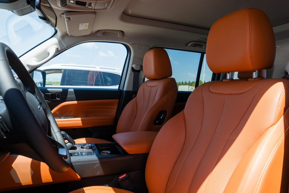 Интерьер — это прям премиум-премиум, хотя по факту материалы используются не самые дорогие. Зато грамотно. Кожаная отделка, потолок, обшитый замшей, напоминающей алькантару, и коричнево-рыжая гамма. Выглядит, без сомнений, не только дорого-богато, но и комфортно. В сидениях утопаешь, места вокруг столько, что хоть руками маши.