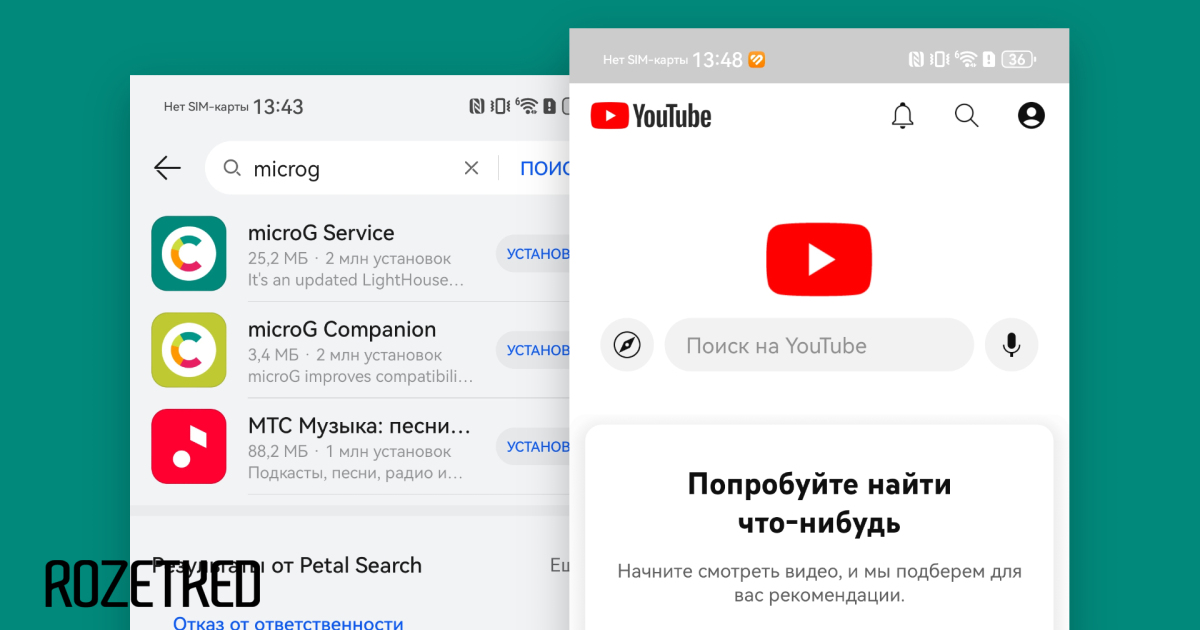 - Через поиск по магазину найдите и установите два приложения: microG и microG Companion.