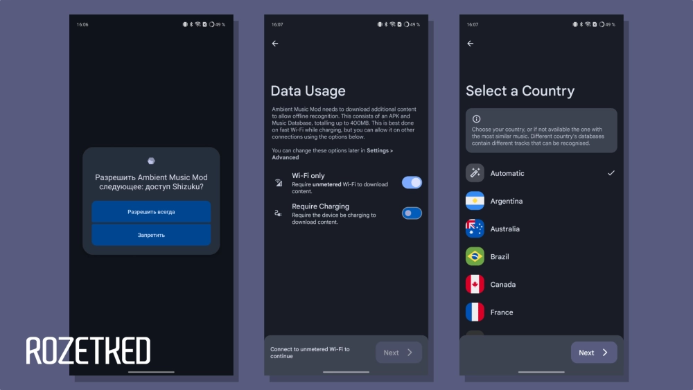 О том, как установить и активировать Shizuku, вы можете узнать из инструкции выше. А для установки порта Now Playing понадобится сразу два приложения: сам Ambient Music Mod и модификация ASI, которую Куинн назвал Now Playing. А чтобы всё работало офлайн, при первом использовании сервиса потребуется скачать базу композиций объёмом порядка 400 МБ.
