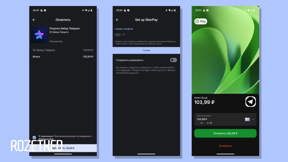 - Если платёж будет проходить через @PremiumBot, сервис предложит настроить способ оплаты, если вы не сделали этого ранее. В нативных приложениях есть вариант оплаты через SberPay: достаточно ввести номер телефона, который привязан к счёту в «СберБанке». Транзакцию необходимо провести по ссылке, которую «Сбер» пришлёт в SMS.