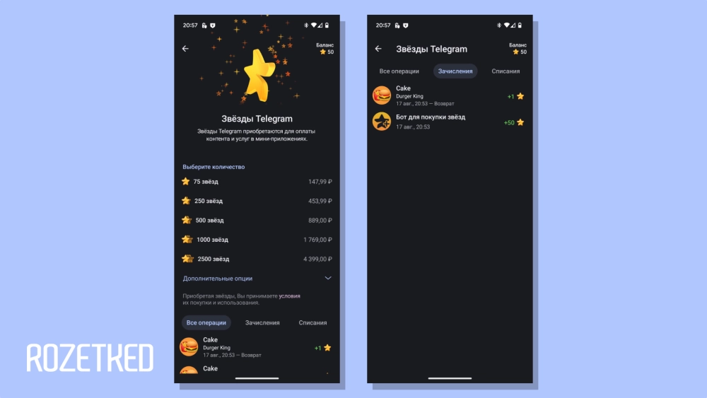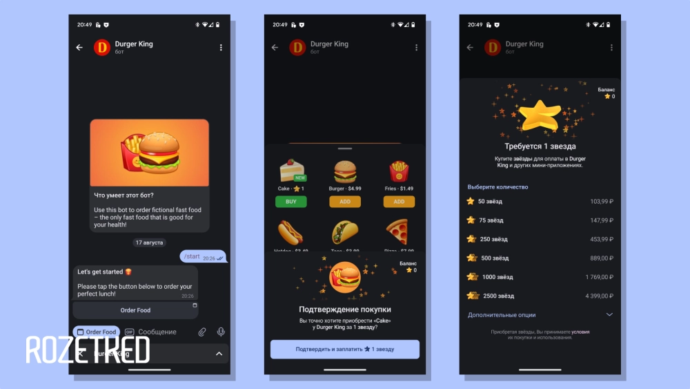 - Выбранное количество Stars зачислится на счет в Telegram. Durger King спишет и тут же вернёт «звезду» за виртуальный торт.
