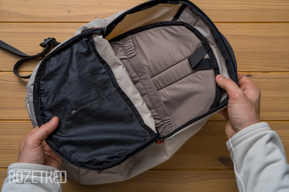 Рюкзак целиком сделан из водоотталкивающего рипстопа и с водонепроницаемыми молниями. Ходят плавно и мягко, и на них классные контрастные пуллеры. Спинка и лямки с крупной перфорацией, так что жарко не было. Никакого каркаса тут, разумеется, нет — его можно скрутить как шопер и он займёт минимум места.