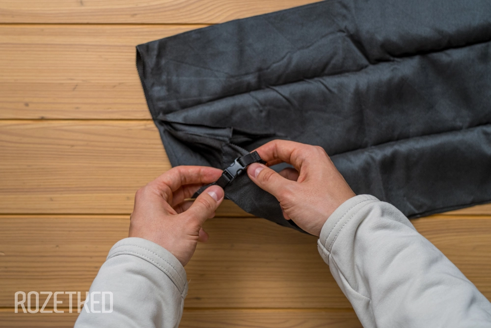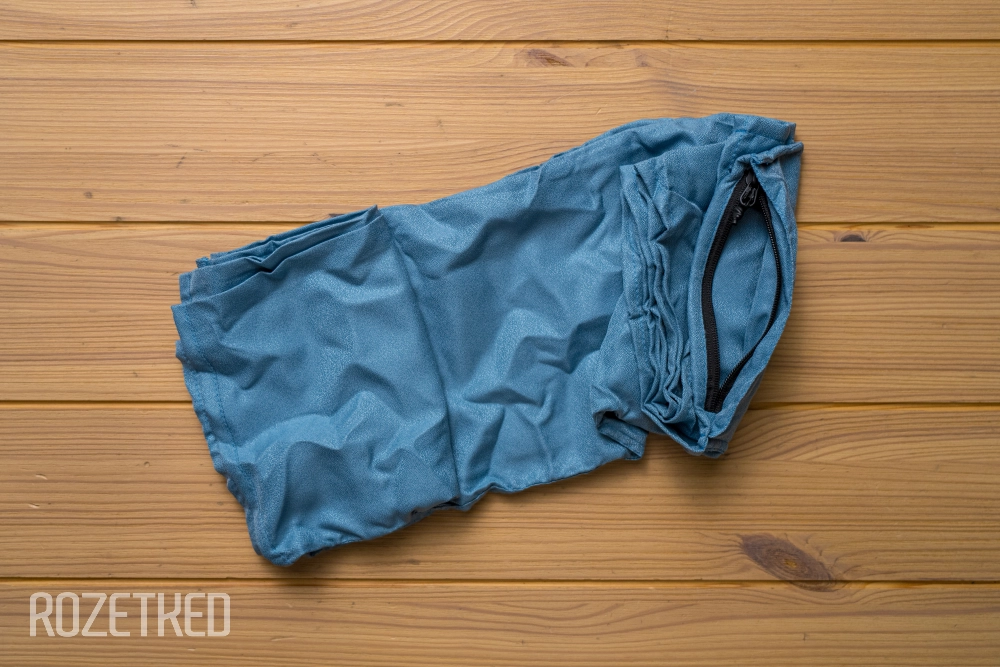 Оно выполнено из нейлона с водоотталкивающим покрытием, в уголках есть карманы для песка, чтобы утяжелить плед, а также колышки. Чехол тоже встроен, хотя складывать плед — тот ещё квест, даже несмотря на то, что ребята сделали разметку с подсказками как это правильно делать.