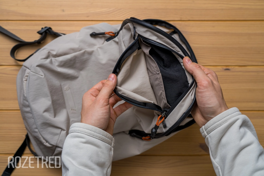 В основном отделении никаких разделителей, кроме одного кармашка на резинке, который предназначен для гидратационного пузыря (тут даже петелька есть). Воды налил, трубку под лямку протянул и пьёшь на ходу. Но и ноутбук на 14 дюймов сюда помещается, носить только аккуратно нужно, так как защиты никакой толком нет. В остальном это просто отдел-мешок, куда можно кучей накидать вещей.