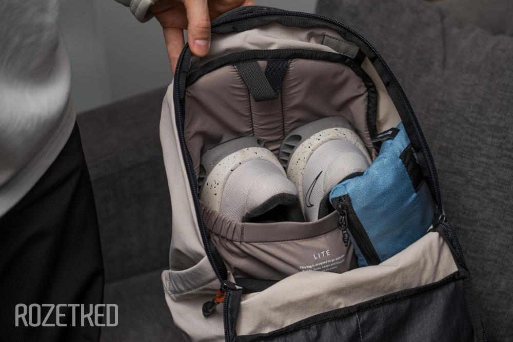 Поэтому искал ультралёгкий, компактный и дышащий вариант без какой-либо сложной организации пространства. Кинуть полотенце, тапки, кепку, бутылку воды, и чтобы спина не потела — вот основной запрос.