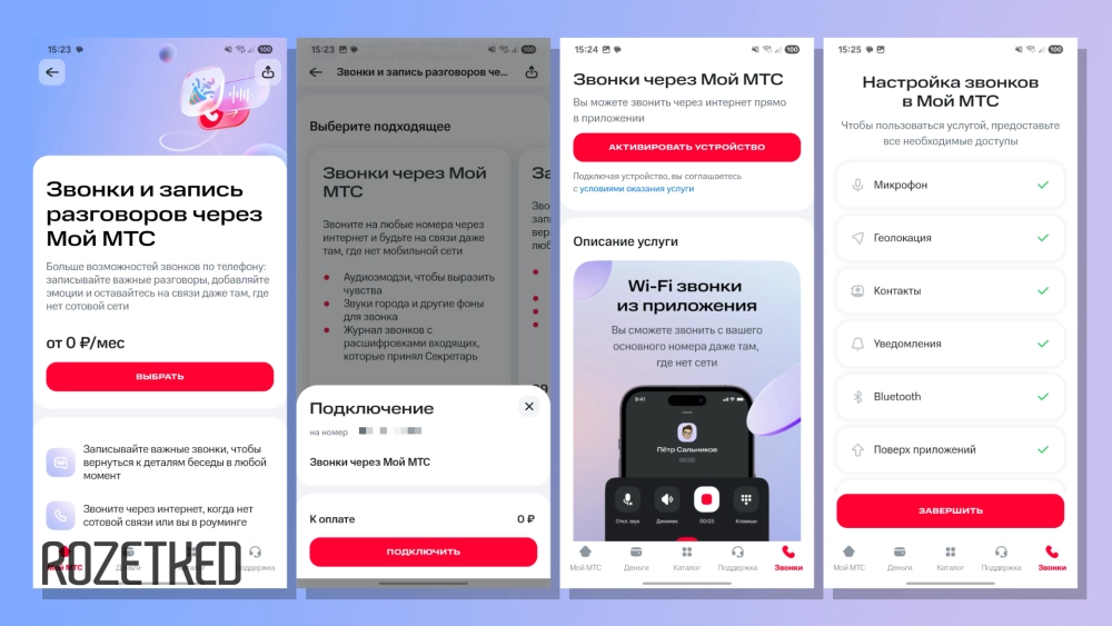 Запись звонков вынесена в отдельную услугу, которая доступна бесплатно в первый месяц и за 99 рублей в последующие. Предложение включить функцию появится при настройке «Звонков через Мой МТС», но если пропустили, жмите на шестерёнку на вкладке «Звонки» → «Запись звонков» → «Подключить».