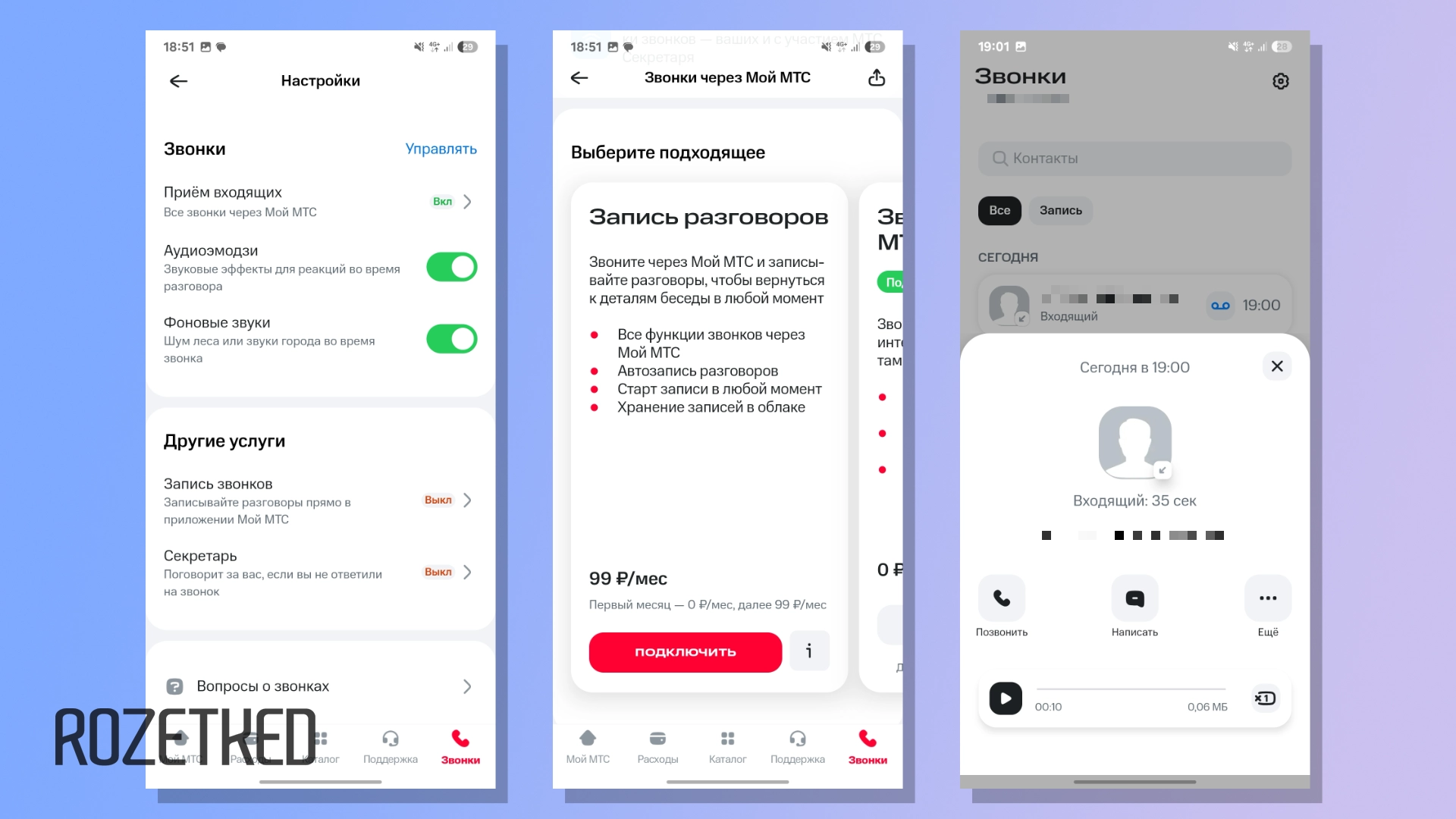 Запись звонков вынесена в отдельную услугу, которая доступна бесплатно в первый месяц и за 99 рублей в последующие. Предложение включить функцию появится при настройке «Звонков через Мой МТС», но если пропустили, жмите на шестерёнку на вкладке «Звонки» → «Запись звонков» → «Подключить».