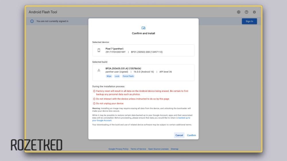 - Сервис предупредит, что установка приведёт к сбросу смартфона к заводским настройкам. Во время процедуры нельзя взаимодействовать с устройством и отключать от компьютера. Нажмите Confirm.