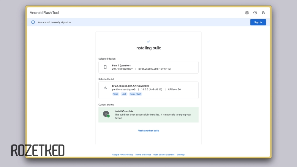 После того, как на экране Android Flash Tool появится подтверждение установки, можно включить устройство и отключить его от кабеля. После запуска вы увидите экран первичной настройки Pixel с выбранной версией операционной системы.