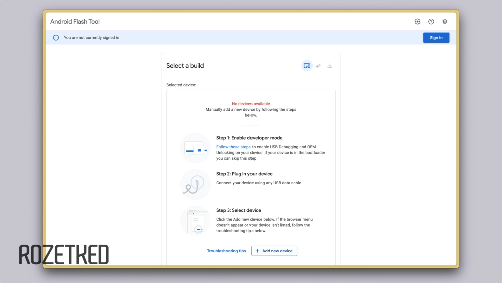 - В интерфейсе Android Flash Tool нажмите на кнопку Allow ADB Access, а на следующем экране — Add new device.