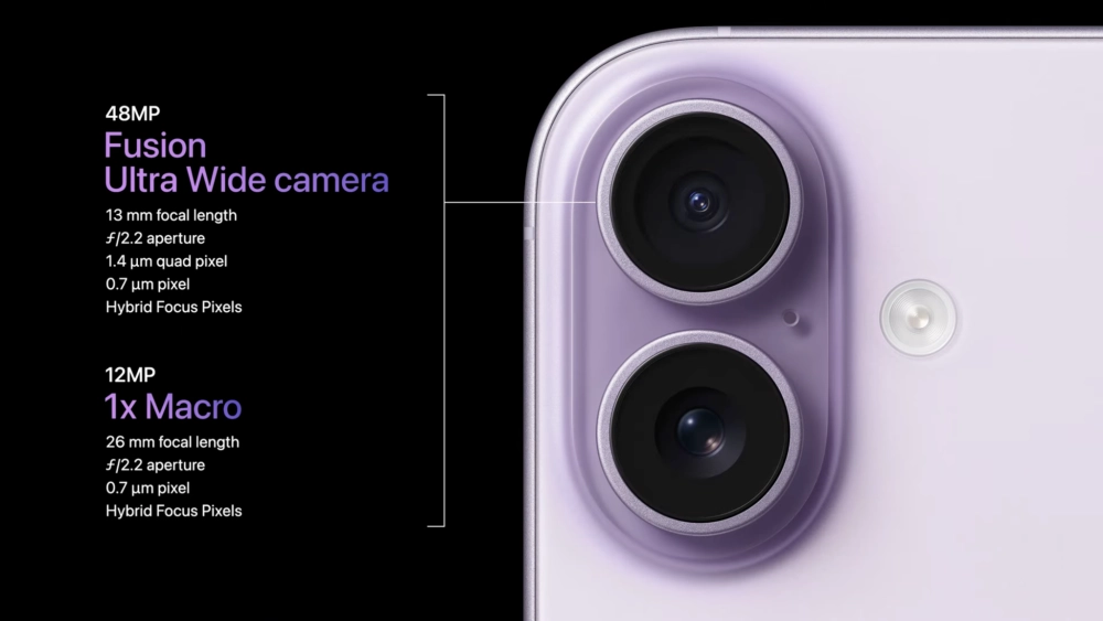 Fusion на 48 Мп. Как и раньше, это так называемая камера «2-в-1»: основной модуль + телевик, который на деле просто кроп 2x. По большому счёту это тот же основной модуль, что в iPhone 16.
