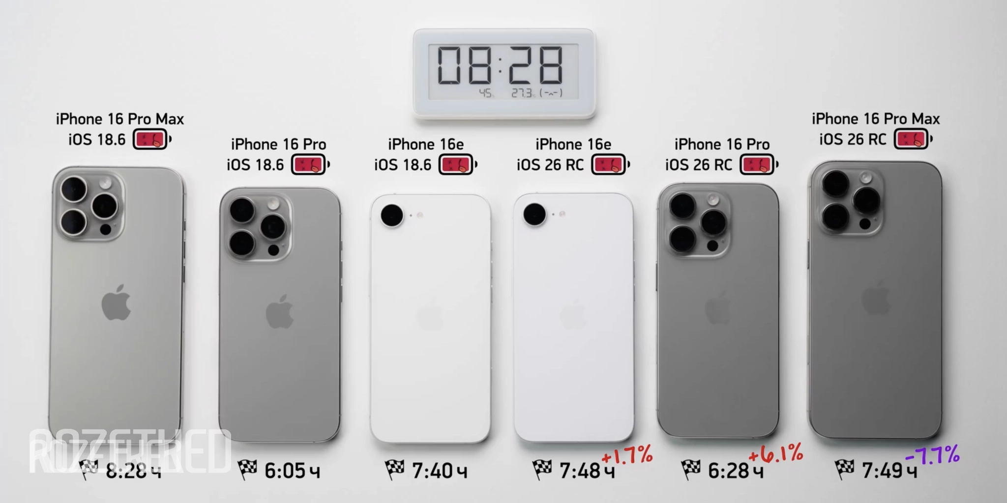 Результаты удивили. Да, очевидно, что первым сел iPhone 16 Pro, но не очевидно, что первой ушла версия с iOS 18. А вот версия на iOS 26 продержалась на 6% дольше. Внезапно.
