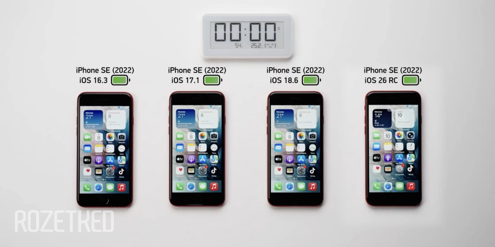 Для теста использовали три iPhone SE (2022): один на iOS 16, второй на iOS 17, а третий сначала протестировали на iOS 18, а потом — на iOS 26. Чтобы у вас не возникло подозрений в том, что это разные iPhone с разными батарейками.