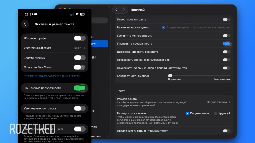 В macOS настройка отключает вообще всю прозрачность: появляется подложка под строкой меню, а фоны боковых панелей в приложениях из размытых превращаются в сплошные.