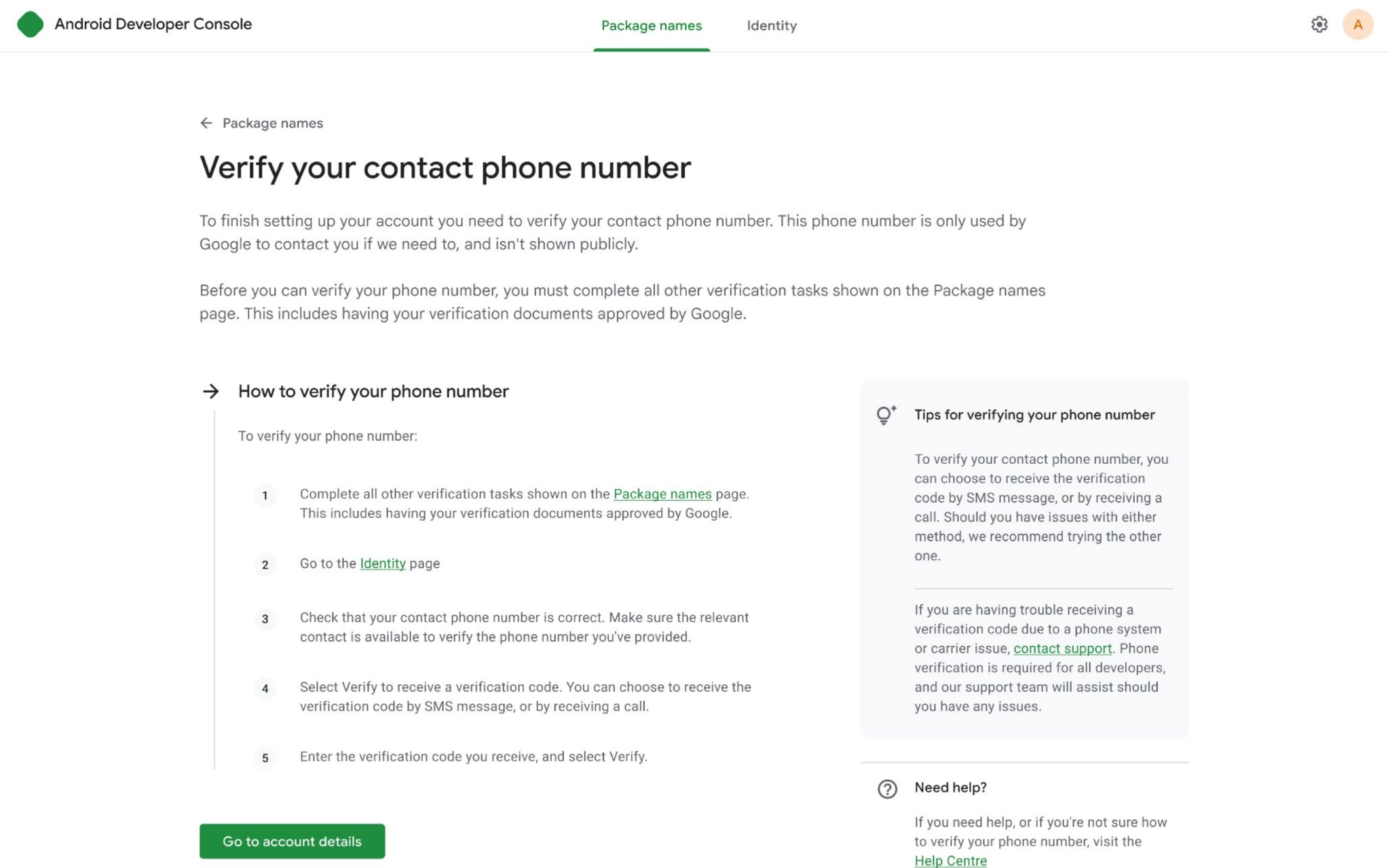 Экран подтверждения номера телефона разработчика в панели Android Developer Console