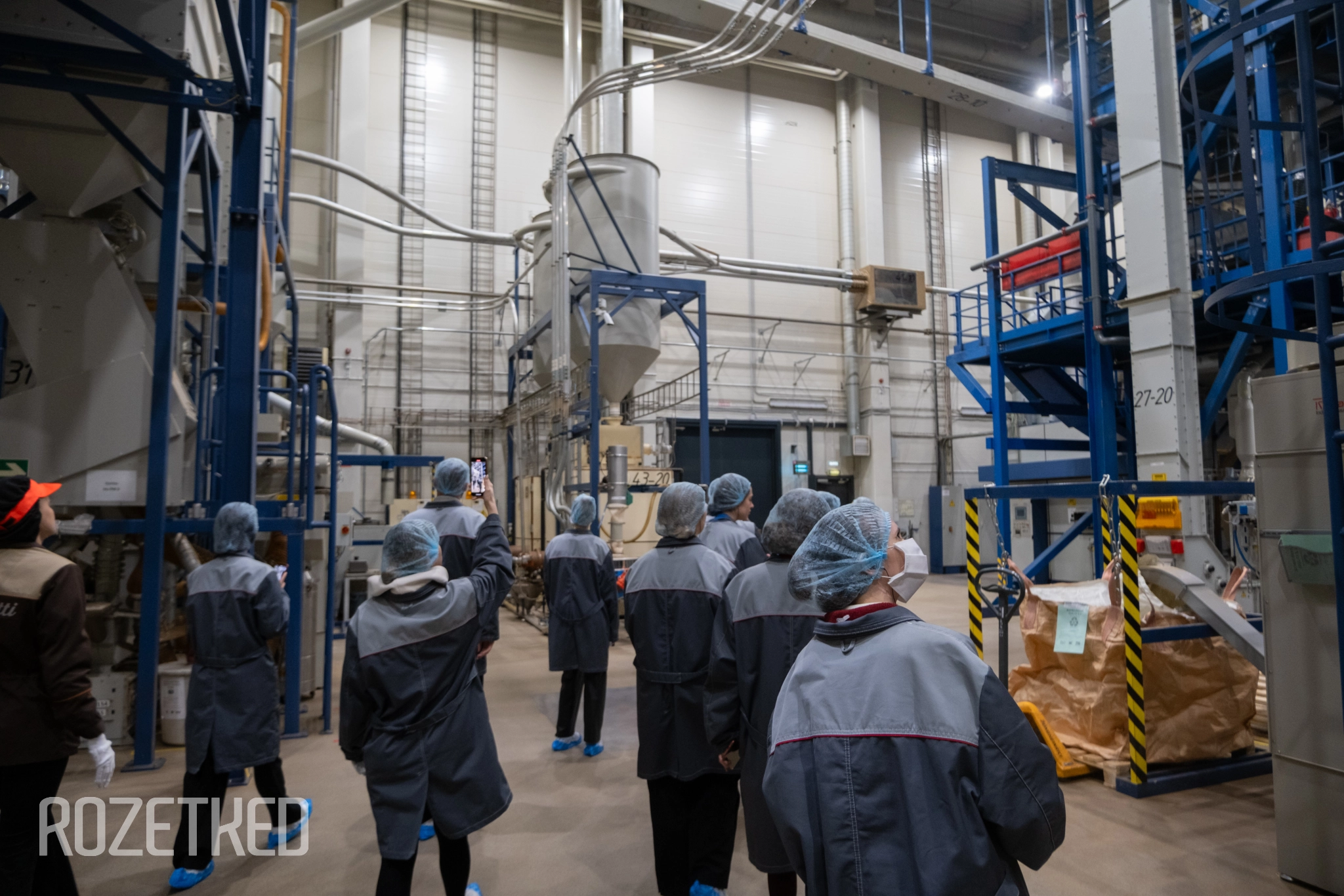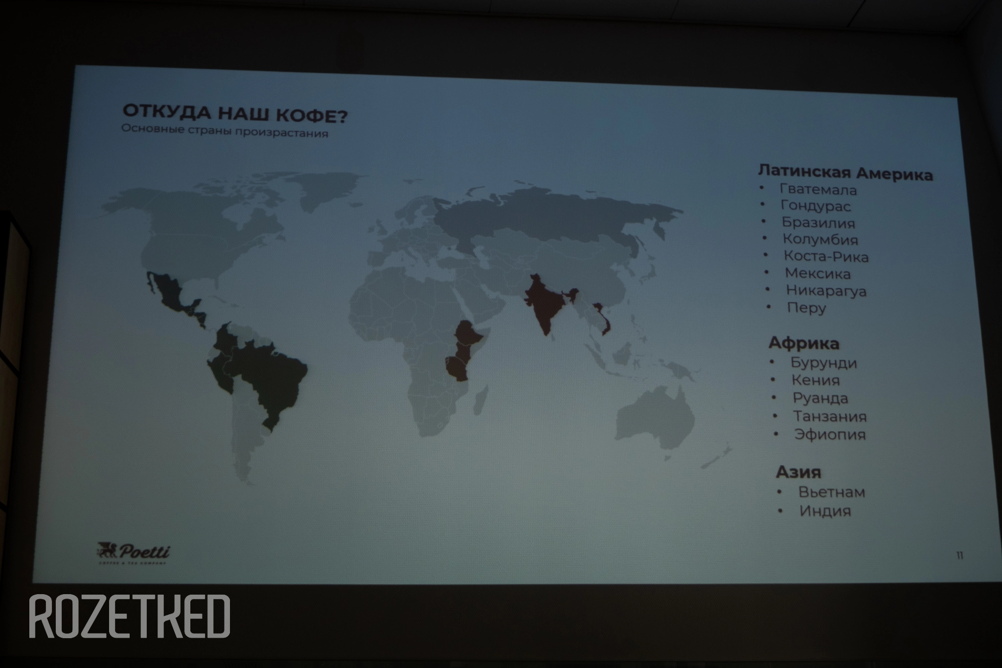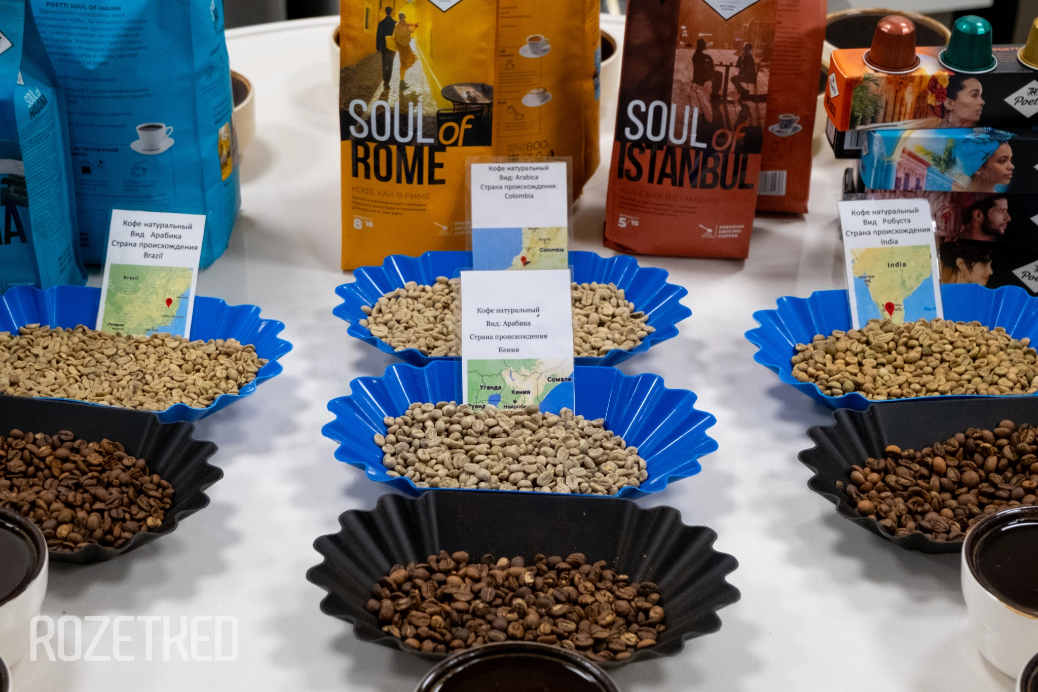 Нам показали весь путь кофейного зерна — от мешков с урожаем до готовых пачек. Сырьё поступает к Poetti в виде зелёных необжаренных зёрен со всего мира: от Латинской Америки до Африки и Азии. Например, в блендах «Вкусно — и точка» используют смесь зёрен арабики с добавлением робусты, которые приезжают из Бразилии, Колумбии и Гондураса.