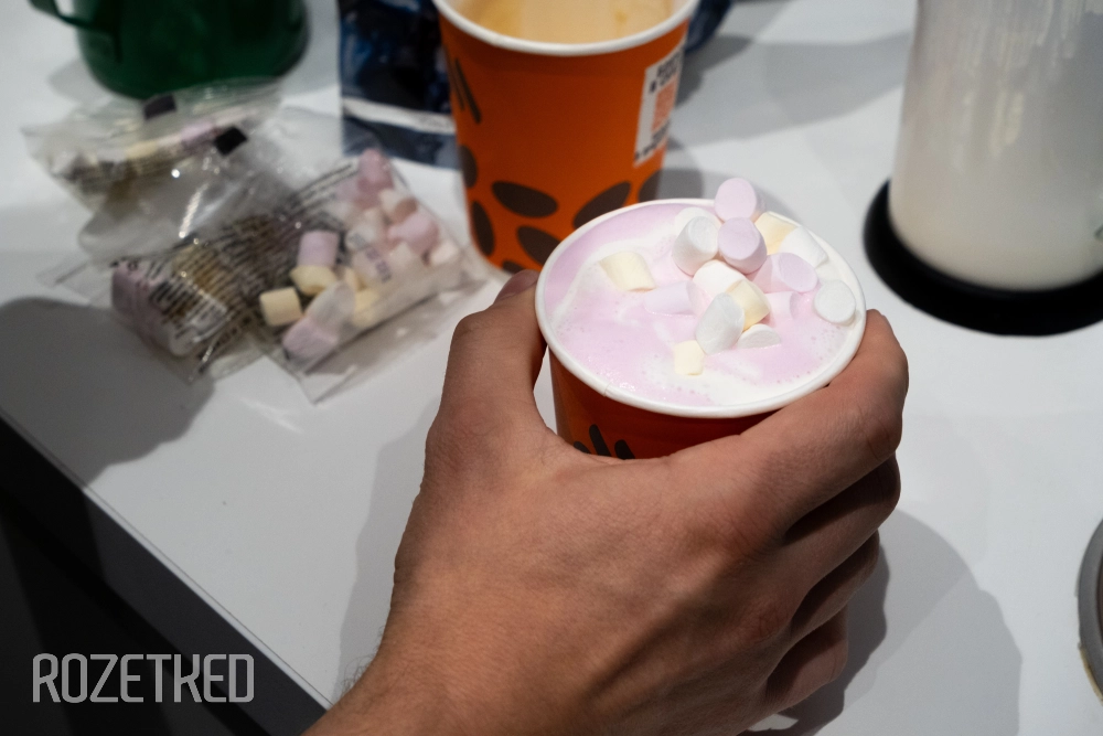 Пятое место. Розовый горячий шоколад — единственный новый напиток для тех, кто не пьёт кофе. Классная подача с маршмеллоу и сливками и нежно-розовый цвет белого шоколада. Хотя воспринимается этот напиток больше как тёплый молочный коктейль, потому что нет «тягучести» привычного шоколада. Удивительно, но он ощущается менее приторным, чем раф.