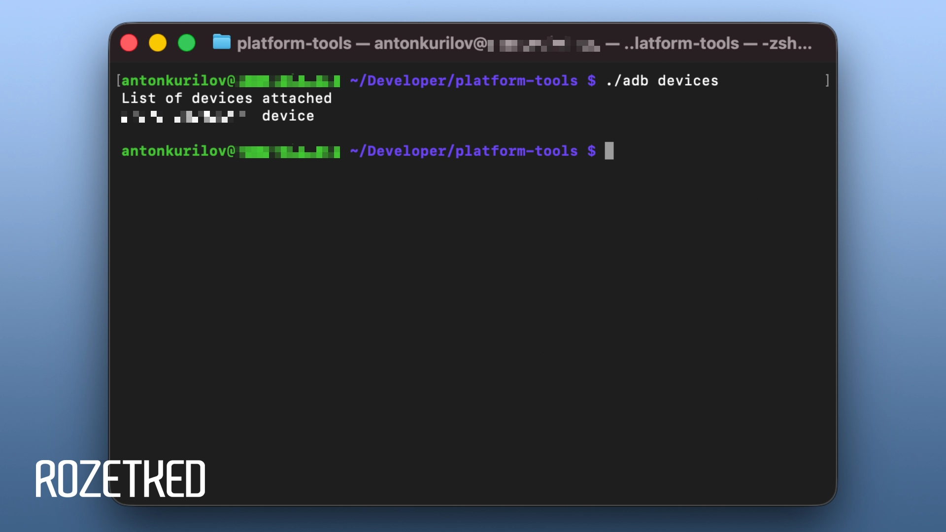 - Введите в терминале на компьютере команду для запуска службы ADB и нажмите Enter. Примечание: в случае ошибки попробуйте команду без ./ в начале: ./adb devices