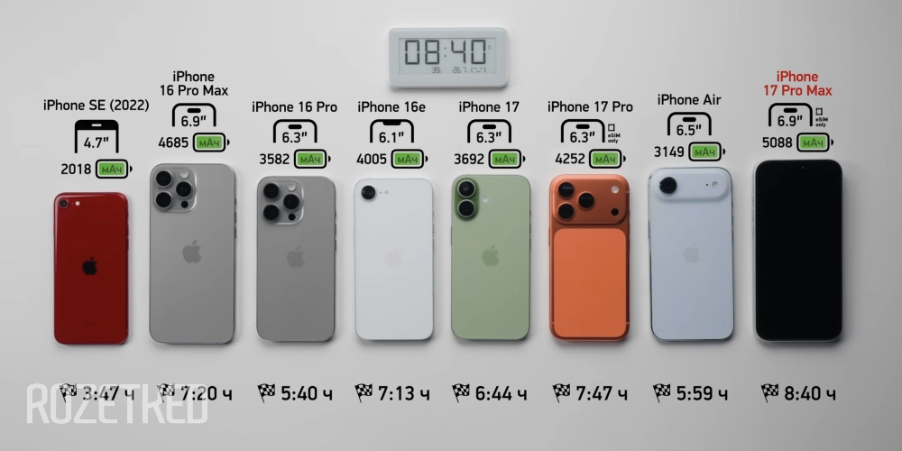 | iPhone 17 Pro Max (eSIM-only) | — | 8 часов 6 минут 🏆 | 8 часов 40 минут 🏆 | держит больше на 34 минуты |
