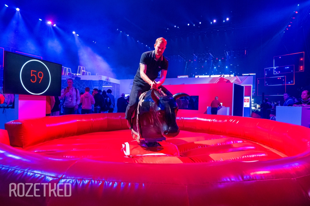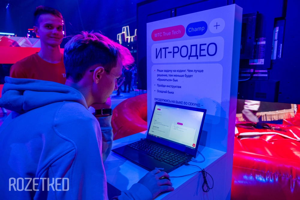Здесь расположили IT-родео. Если решаешь задачу по программированию, то можешь попытать удачи и продержаться минуту на механическом быке, а после — получить монеты для мерч-шопа. Желающих оседлать его было много, но не всем это удалось.