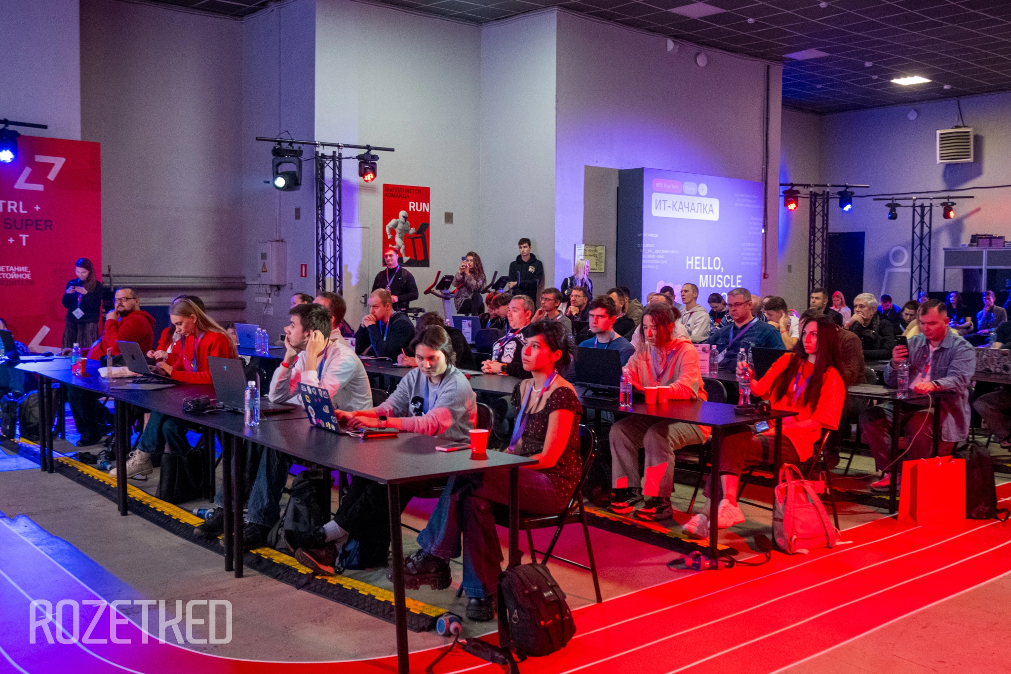 Но для офлайн-посетителей тоже был эксклюзивчик — IT-качалка. Пространство, стилизованное под спортивный зал для мозгов. Там проходили лекции, воркшопы по AI-инструментам и даже дебаты на темы вроде «нужно ли удерживать ценного сотрудника». А в конце завершили красиво — стендапом.