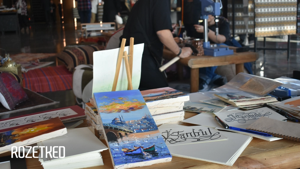 - Мастерские: можно было выпиливать узоры на плитке, ткать на настоящем станке или создавать бижутерию. Особой популярностью пользовалась зона чеканки — звон молоточков по бронзовым чашкам создавал тот самый шум восточного базара.