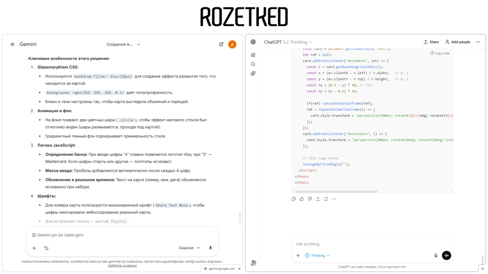 GPT-5.2 Thinking думала в 2 раза дольше конкурента и выдала массивный код на 683 строки. Зато результат выглядит эффектнее: нейросеть реализовала настоящий 3D-эффект — карта поворачивается и бликует при наведении мыши.