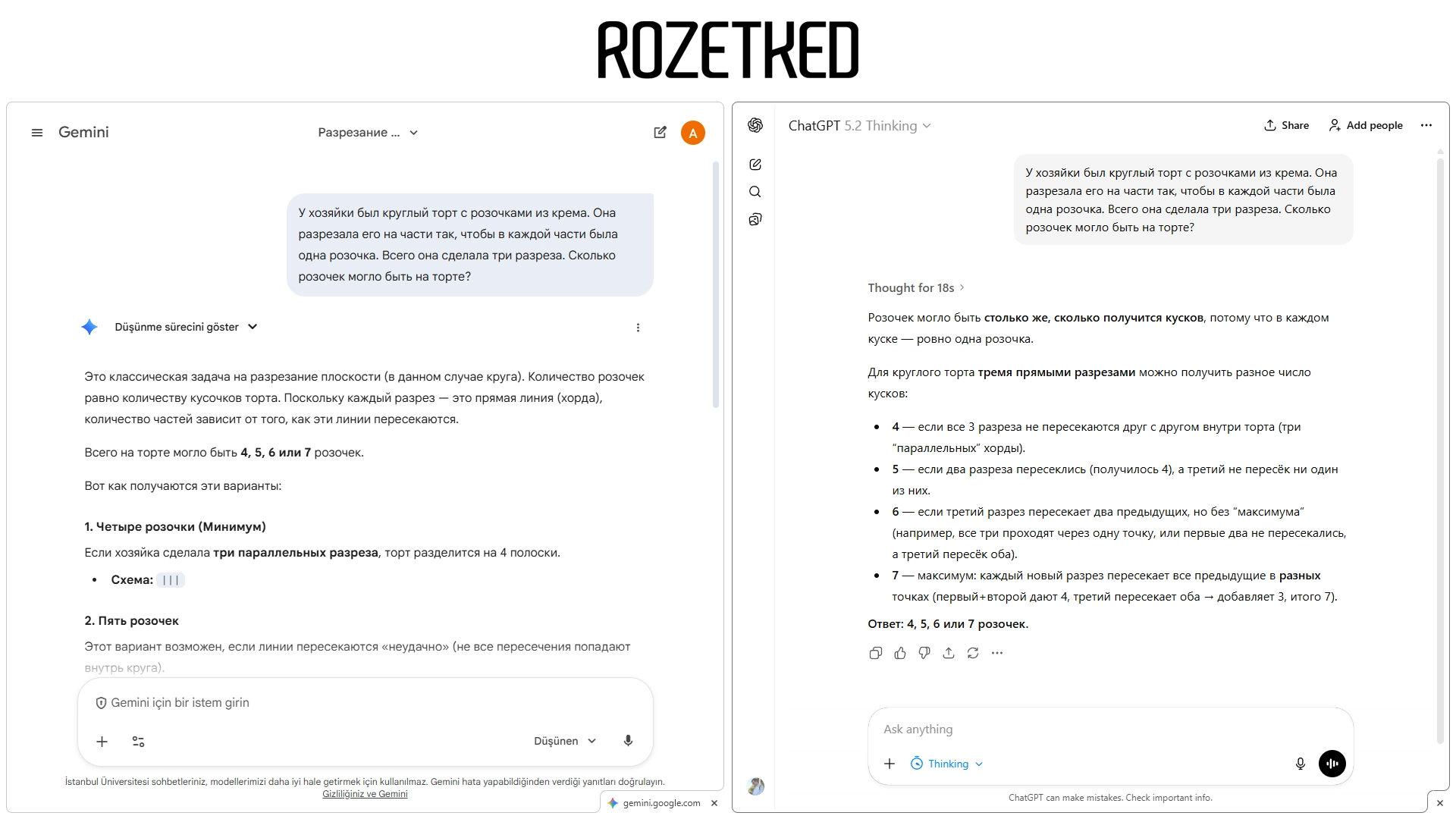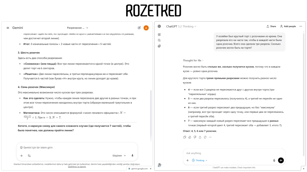 GPT-5.2 Thinking потратила 18 секунд на размышление и выдала академически точный ответ. Модель педантично расписала все сценарии: от параллельных линий (4 куска) до «максимума» (7 кусков), структурировав ответ, как обычно это делает.