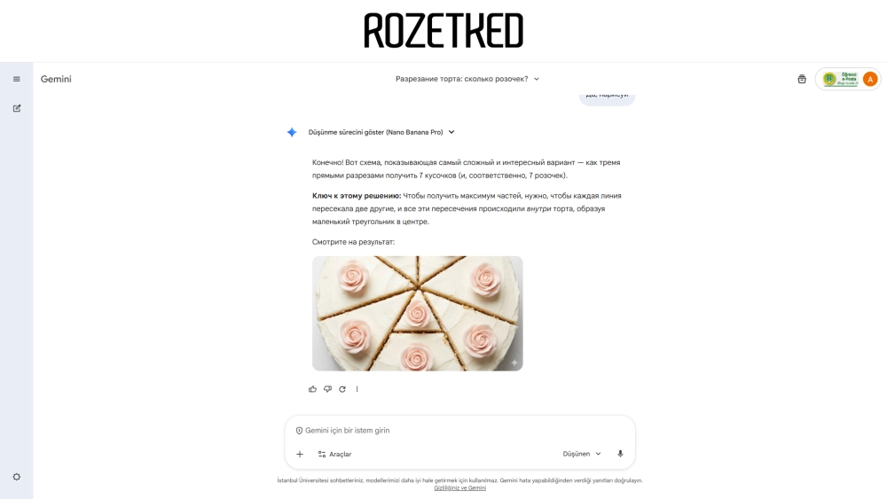 Gemini 3 Pro тоже дала верный ответ (4, 5, 6 или 7), но подход принципиально другой. Она не просто посчитала, а предложила сгенерировать изображение силами Nano Banana Pro, наглядно показав схему разрезов для самого сложного случая (7 частей).