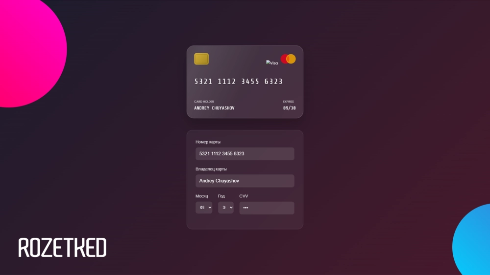 - Логотип банка (Visa/Mastercard) должен меняться автоматически в зависимости от первой цифры (4 — Visa, 5 — MC).