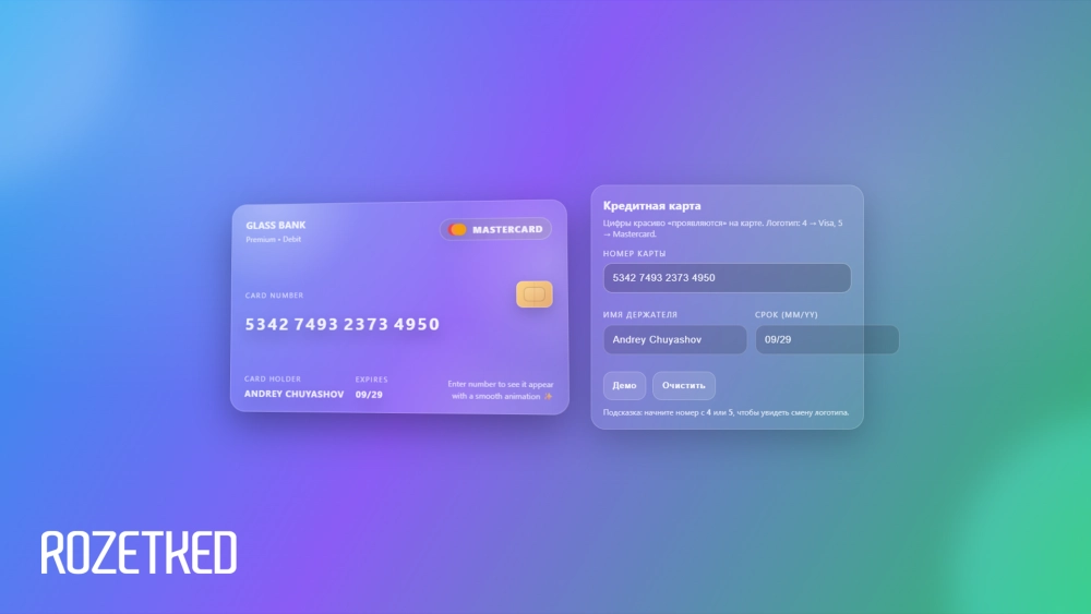 Промпт: Напиши один HTML-файл (с CSS и JS внутри), который создаёт виджет «Кредитная карта» в стиле Glassmorphism (эффект матового стекла). Требования: