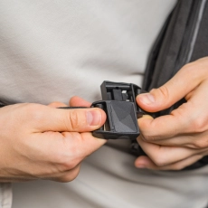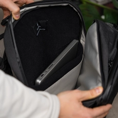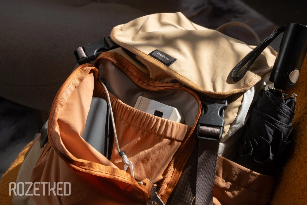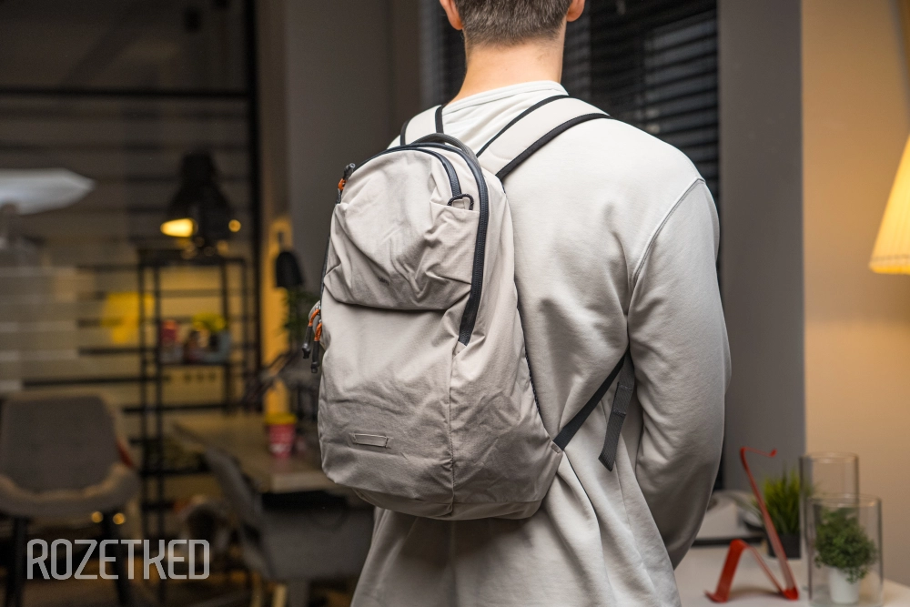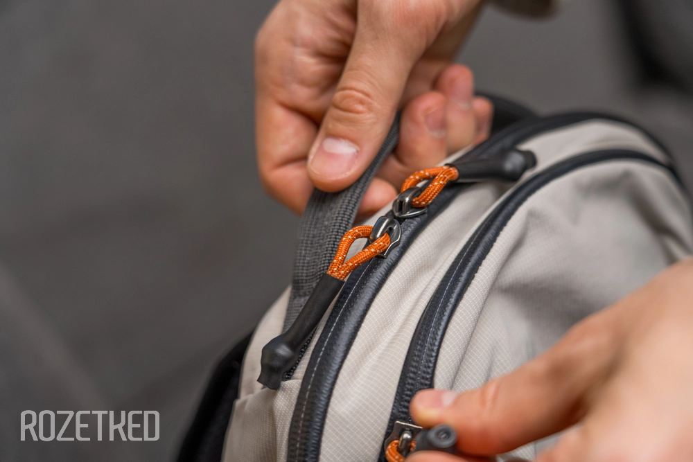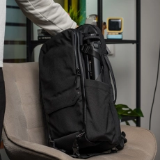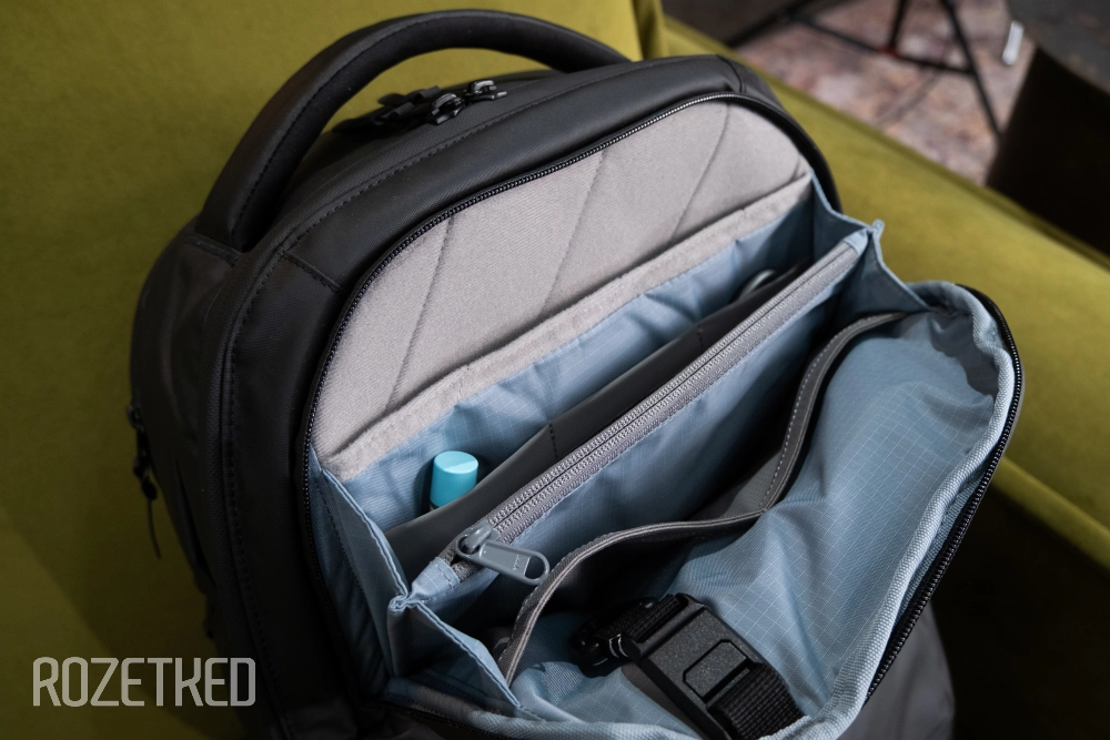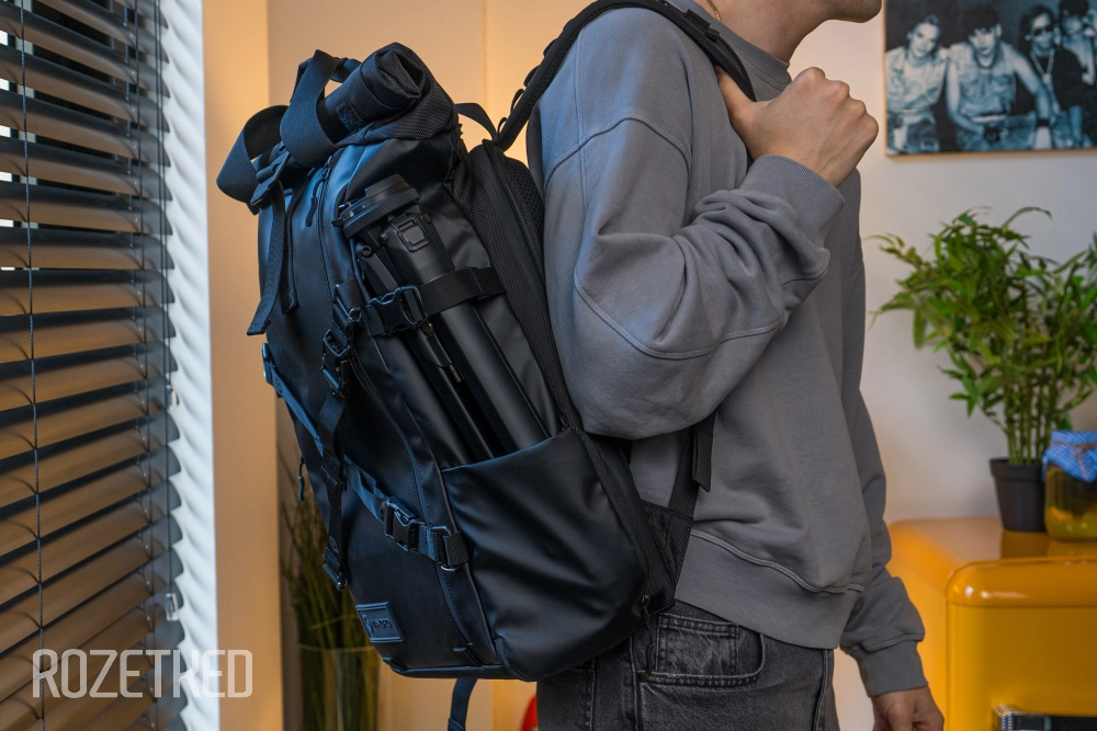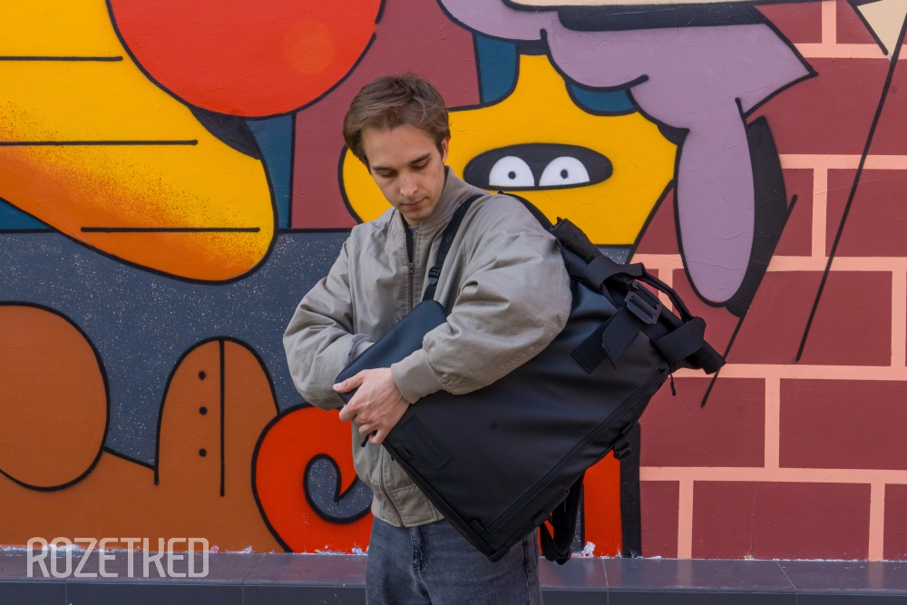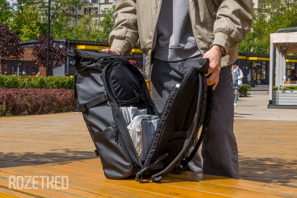 Уникальным его также делает ролл-топ конструкция, которую можно раскрутить и уместить в рюкзак больше вещей. При этом доступ к основному отделению останется со стороны спинки, где есть молния. Также к нему продаются различные аксессуры для крепления снаружи, например, штатива или туристических принадлежностей.