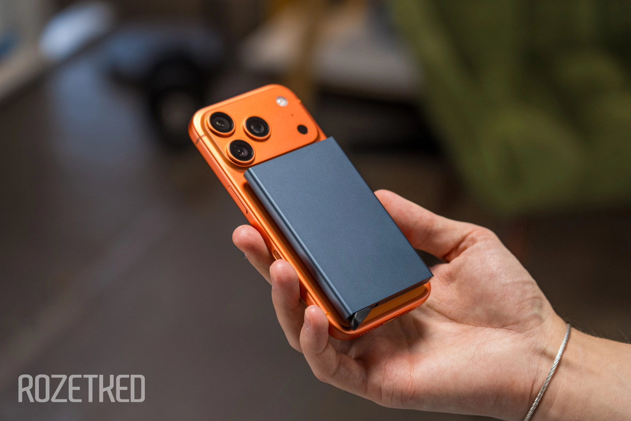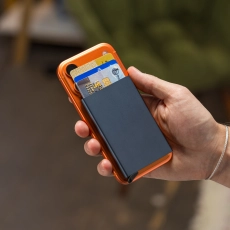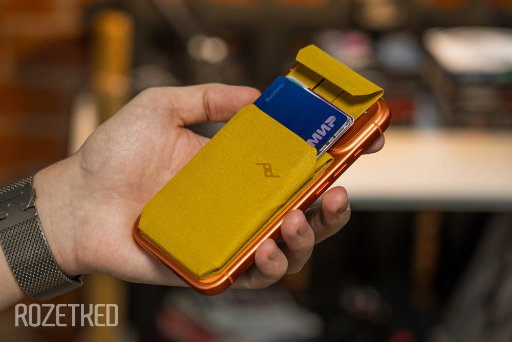 Самая классическая модель, куда просто добавили магниты (очень сильные). Причём, вытаскивать карты можно даже не отлепляя картхолдер от смартфона, блок камер не мешает. Внутри помещаются 4 тиснённые карты или 6 плоских, но даже если положить одну, то она не выпадет. Также есть NFC- и RFID-защиты. Из минусов — царапается.